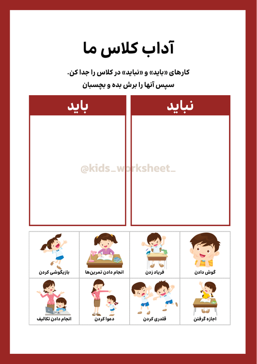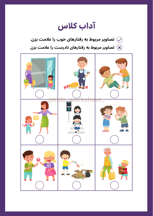 این پک شامل ۶ کاربرگ فارسی قابل چاپ هست که هر کدوم با طراحی جذاب و رنگارنگ، یکی از قوانین مهم کلاس رو آموزش میده.